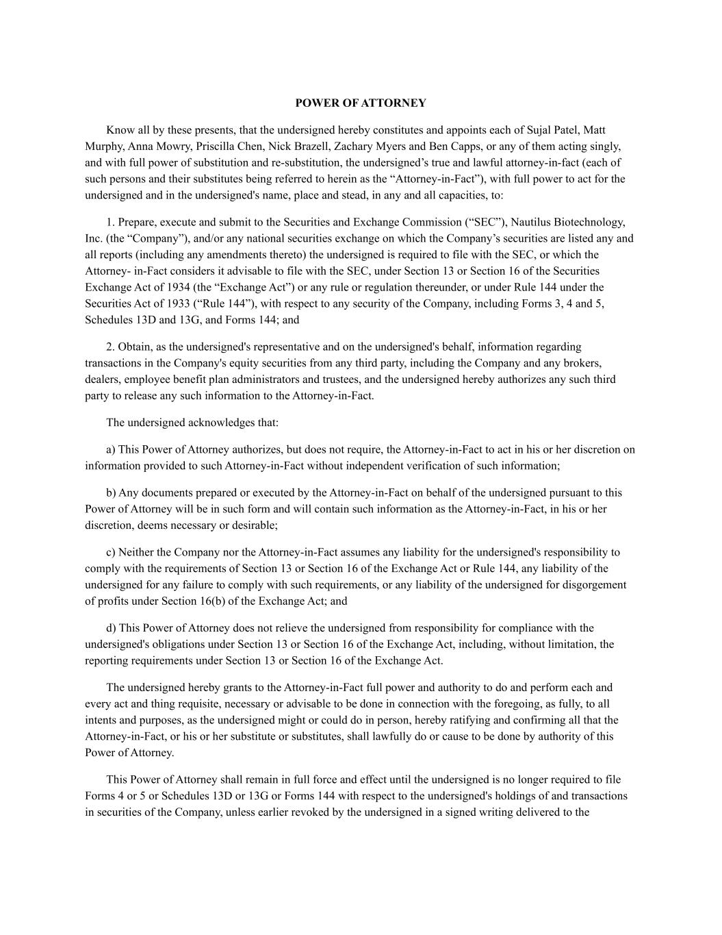 POWER OF ATTORNEY Know all by these presents, that the undersigned hereby constitutes and appoints each of Sujal Patel, Matt Murphy, Anna Mowry, Priscilla Chen, Nick Brazell, Zachary Myers and Ben Capps, or any of them acting singly, and with full power of substitution and re-substitution, the undersigned’s true and lawful attorney-in-fact (each of such persons and their substitutes being referred to herein as the “Attorney-in-Fact”), with full power to act for the undersigned and in the undersigned's name, place and stead, in any and all capacities, to: 1. Prepare, execute and submit to the Securities and Exchange Commission (“SEC”), Nautilus Biotechnology, Inc. (the “Company”), and/or any national securities exchange on which the Company’s securities are listed any and all reports (including any amendments thereto) the undersigned is required to file with the SEC, or which the Attorney- in-Fact considers it advisable to file with the SEC, under Section 13 or Section 16 of the Securities Exchange Act of 1934 (the “Exchange Act”) or any rule or regulation thereunder, or under Rule 144 under the Securities Act of 1933 (“Rule 144”), with respect to any security of the Company, including Forms 3, 4 and 5, Schedules 13D and 13G, and Forms 144; and 2. Obtain, as the undersigned's representative and on the undersigned's behalf, information regarding transactions in the Company's equity securities from any third party, including the Company and any brokers, dealers, employee benefit plan administrators and trustees, and the undersigned hereby authorizes any such third party to release any such information to the Attorney-in-Fact. The undersigned acknowledges that: a) This Power of Attorney authorizes, but does not require, the Attorney-in-Fact to act in his or her discretion on information provided to such Attorney-in-Fact without independent verification of such information; b) Any documents prepared or executed by the Attorney-in-Fact on behalf of the undersigned pursuant to this Power of Attorney will be in such form and will contain such information as the Attorney-in-Fact, in his or her discretion, deems necessary or desirable; c) Neither the Company nor the Attorney-in-Fact assumes any liability for the undersigned's responsibility to comply with the requirements of Section 13 or Section 16 of the Exchange Act or Rule 144, any liability of the undersigned for any failure to comply with such requirements, or any liability of the undersigned for disgorgement of profits under Section 16(b) of the Exchange Act; and d) This Power of Attorney does not relieve the undersigned from responsibility for compliance with the undersigned's obligations under Section 13 or Section 16 of the Exchange Act, including, without limitation, the reporting requirements under Section 13 or Section 16 of the Exchange Act. The undersigned hereby grants to the Attorney-in-Fact full power and authority to do and perform each and every act and thing requisite, necessary or advisable to be done in connection with the foregoing, as fully, to all intents and purposes, as the undersigned might or could do in person, hereby ratifying and confirming all that the Attorney-in-Fact, or his or her substitute or substitutes, shall lawfully do or cause to be done by authority of this Power of Attorney. This Power of Attorney shall remain in full force and effect until the undersigned is no longer required to file Forms 4 or 5 or Schedules 13D or 13G or Forms 144 with respect to the undersigned's holdings of and transactions in securities of the Company, unless earlier revoked by the undersigned in a signed writing delivered to the